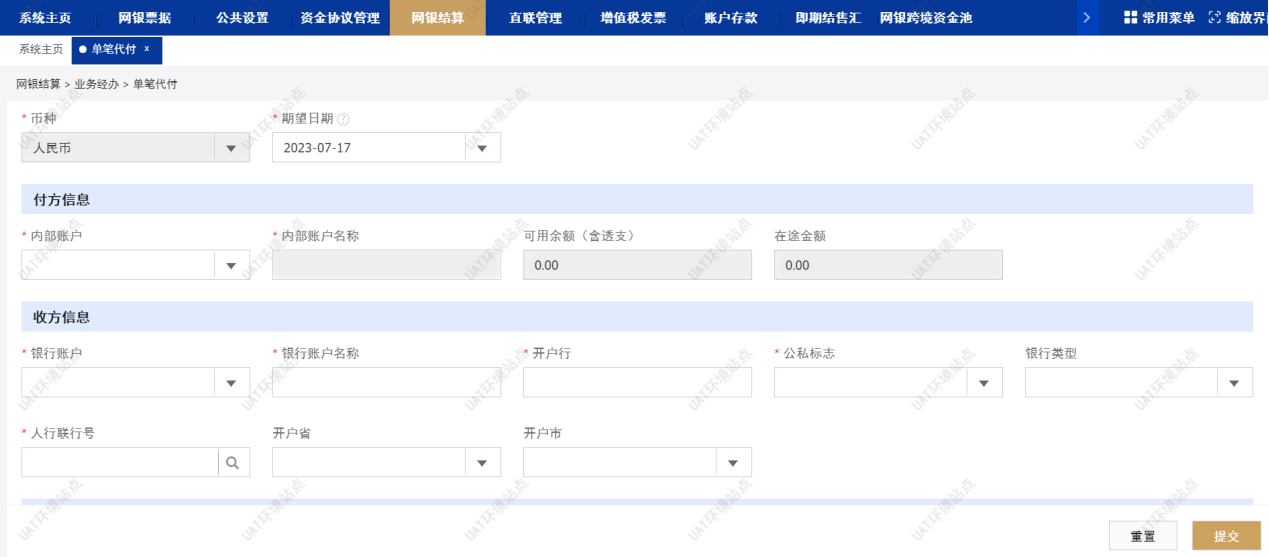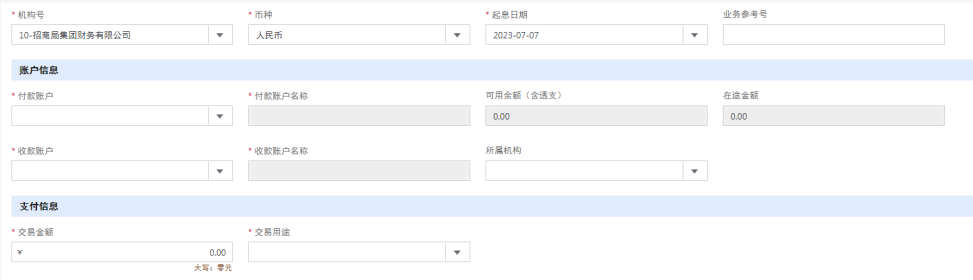 单笔代付:通过招商局财务公司账户向银行账户支付时选择单笔代付。