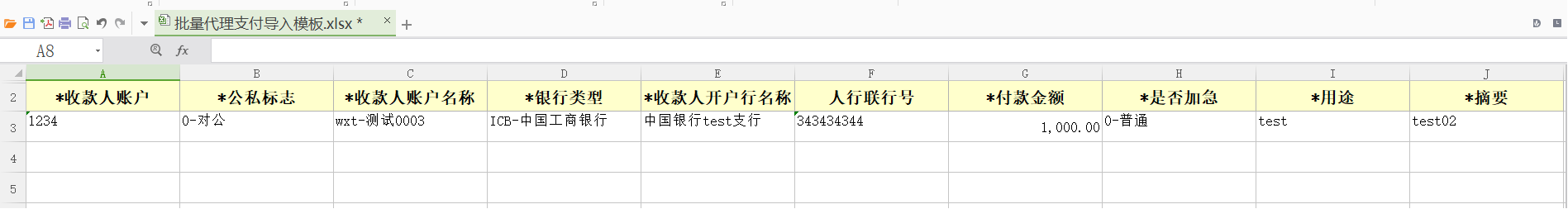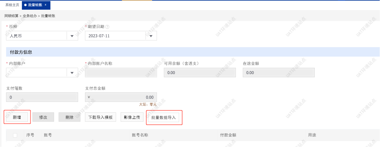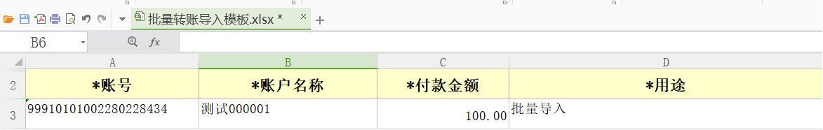 【注意事项】企业经办可通过批量导入模板导入交易信息(包括收款方账户信息、付款金额、摘要用途等),模板中标注*号的均为必填项。提交后复核仍需逐笔审批,如复核发现某笔交易经办录入错误,可以单独退回。