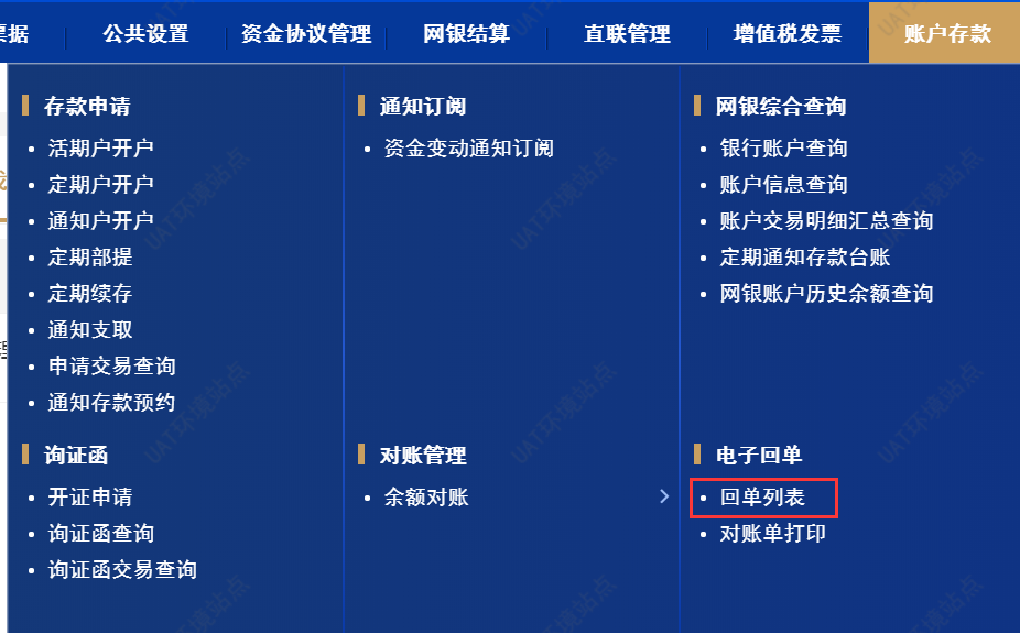 具体菜单路径:【账户存款-->>电子回单-->>回单列表】