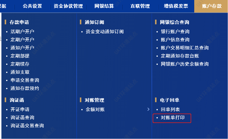 具体菜单路径:【账户存款-->>电子回单-->>对账单打印】