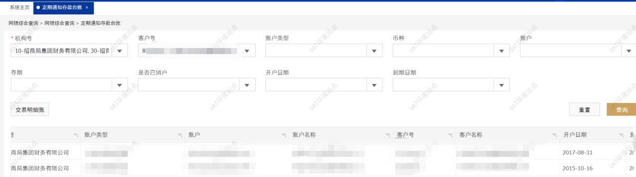 可查询所有定期及通知存款的账户信息及指定账户的交易明细账。
