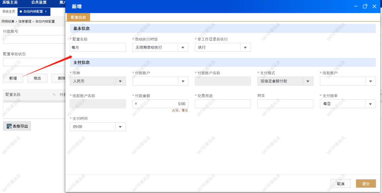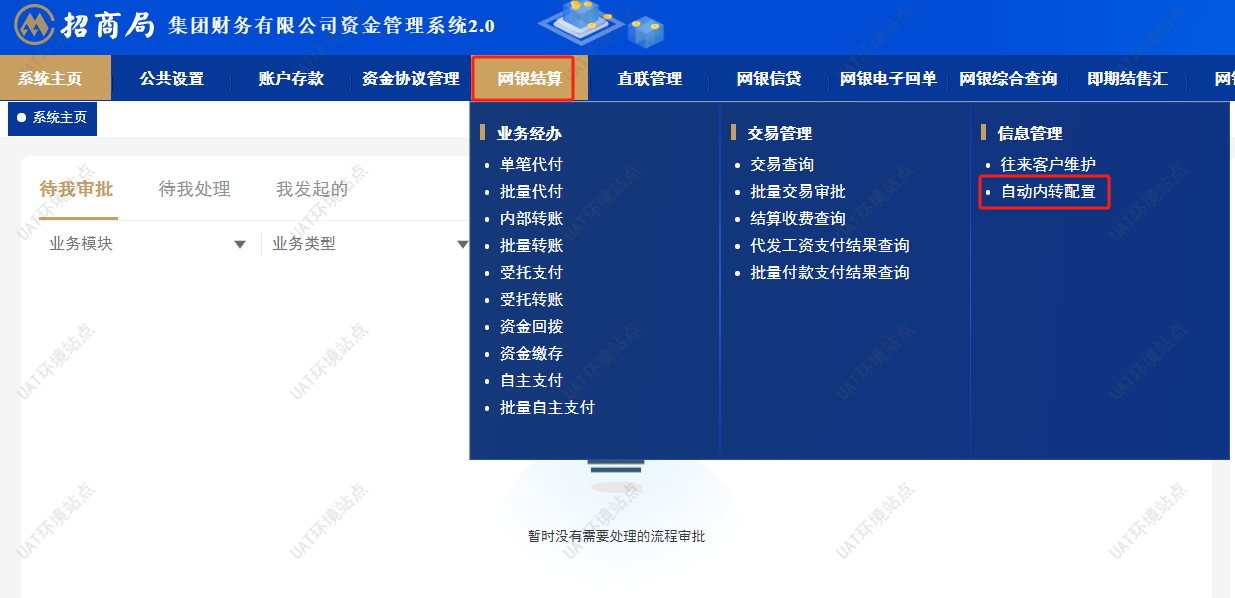 Step1:成员单位经办人员在“网银结算”模块下点击“自动内转配置”。