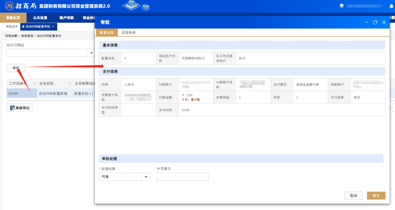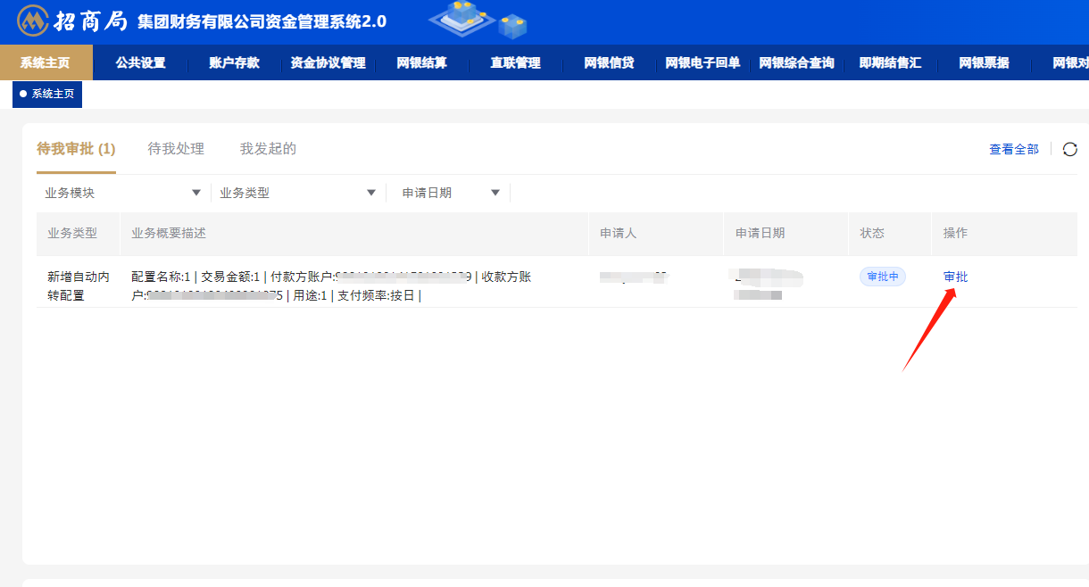 2、自动内转计划提交的转账指令依旧会正常提交给招商局财务公司审批人员审核,审批人员按照正常内部转账审批流程审批。