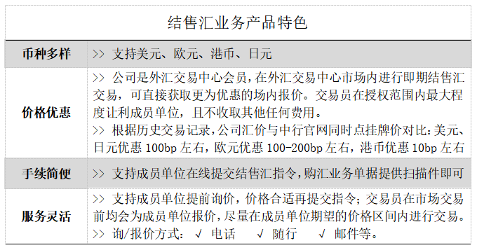 自2014年业务开展以来,公司一直致力于将优惠的结售汇价格惠及更多的成员单位,目前已形成币种多样、价格优惠、手续简便、服务灵活的产品特色。