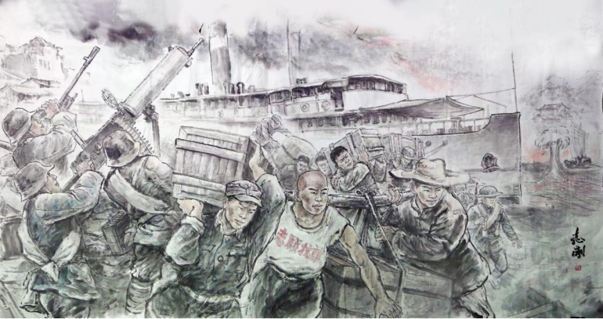 长江岸边,硝烟滚滚,空中敌机来袭,士兵们在甲板架起高炮反击,地上的人群背负物资,蜂拥挤上内迁的船只,其中招商局“江兴”轮赫然在列……
