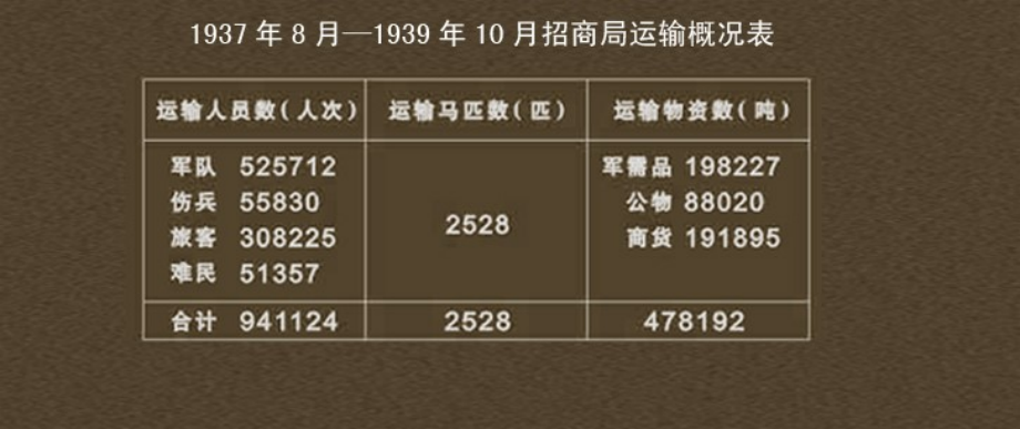 从1937年8月到1939年10月,招商局长江业务管理处克服重重困难,共计运输军队、伤兵、难民及旅客94万余人,马匹2528匹,各种军品、公物、商货47.8万余吨。