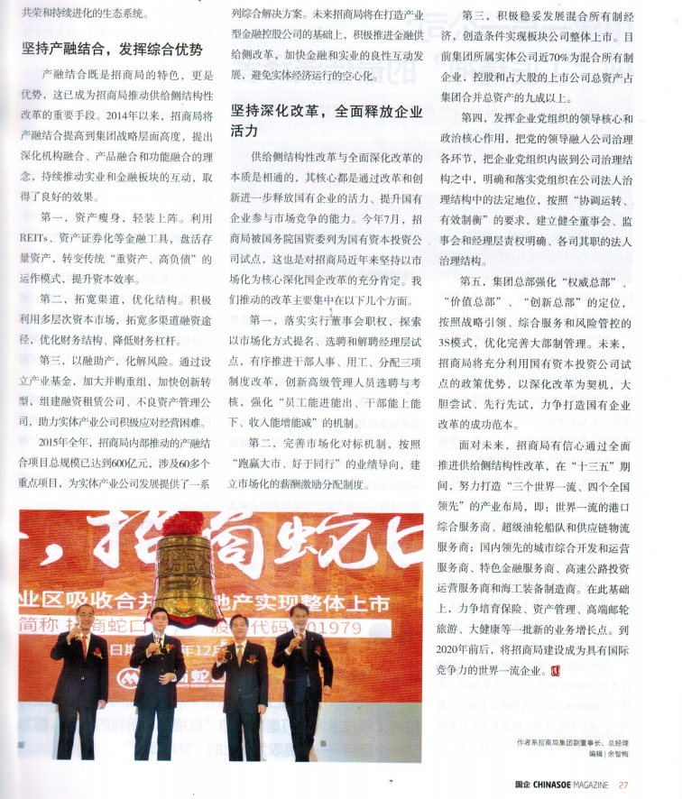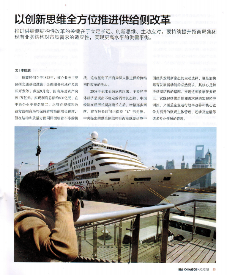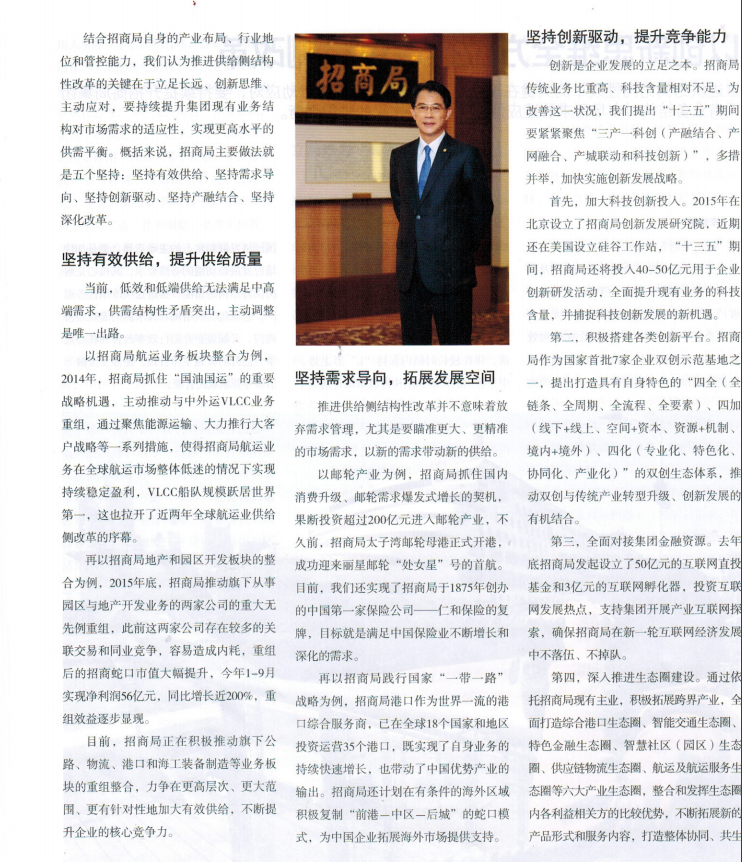 Recently,Fully Structural Reform with Innovation Mindset Written by Li Xiaopeng was posted on CHINASOE published on January, 2017. It mainly aims to promote structural reform based on a bigger picture and innovation mindset, with analysis on China Merchants Group in achieving high standard balance between demand and supply by continuously adjusting the business structure calling to market demands. "China Merchants Group will spare no efforts to nurture growth drivers, such as insurance, capital management, high-end cruise tourism, health industries, to shape as a global competitive enterprise", said Li.