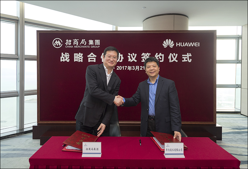 On March 21, 2017 local time, China Merchants Group Executive Vice President Deng Renjie signed Co-operation Agreement with HUAWEI Rotating CEO Guo Ping, officially initiating strategic partnership.