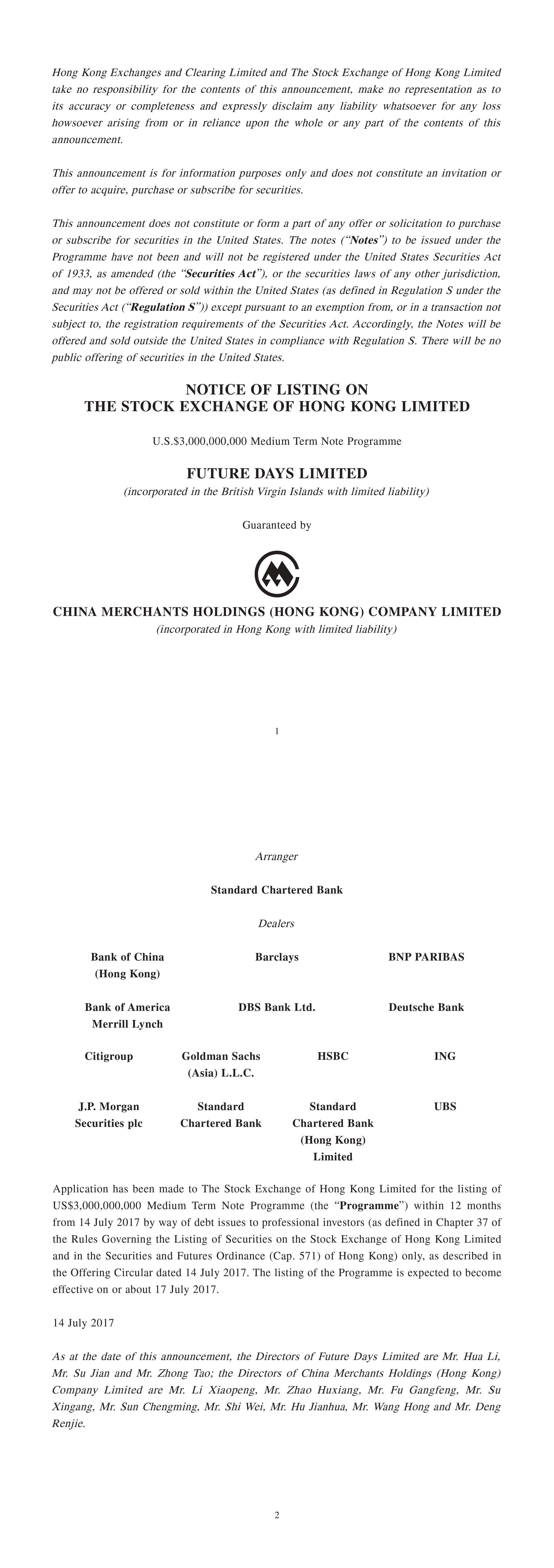 Notice of Listing on the Stock Exchange of Hong Kong Limited - Future Days Limited US$3,000,000,000 Medium Term Note Programme 2017-07-17