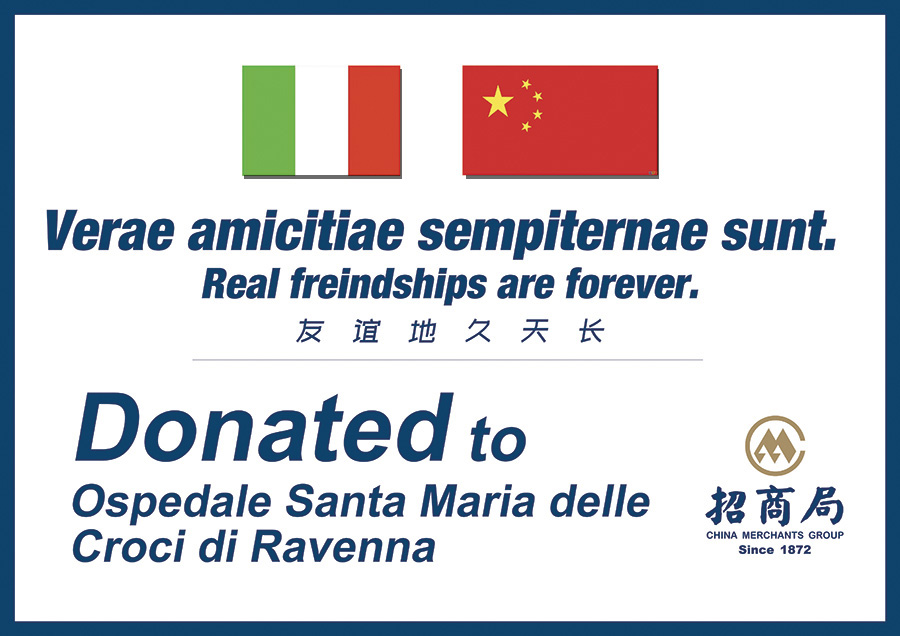 On March 22, the city of Ravenna in Italy sent a request to China Merchants Group about assisting local medical institutions with epidemic prevention materials. Upon receiving the request, the Group attached great importance to the matter. Group Chairman Li Jianhong immediately made an instruction to urge a quick response. China Merchants Charitable Foundation promptly confirmed the actual demand through China Merchants Industry's branch in Italy, simultaneously validated the procurement and transportation channels with the help of the Group's healthcare sector as well as Sinotrans respectively. A working team was quickly formed between a few relevant business sectors. A total of 58,000 pieces of epidemic prevention materials were successfully assembled and sent off within a short time frame.