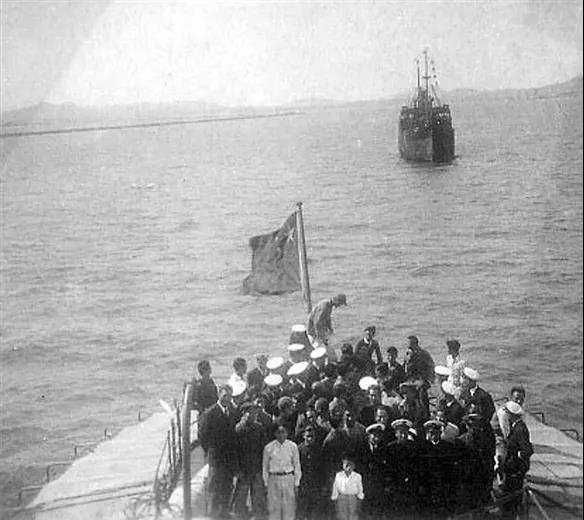 “海辽”轮在驶往大连港途中,升起了五星红旗。