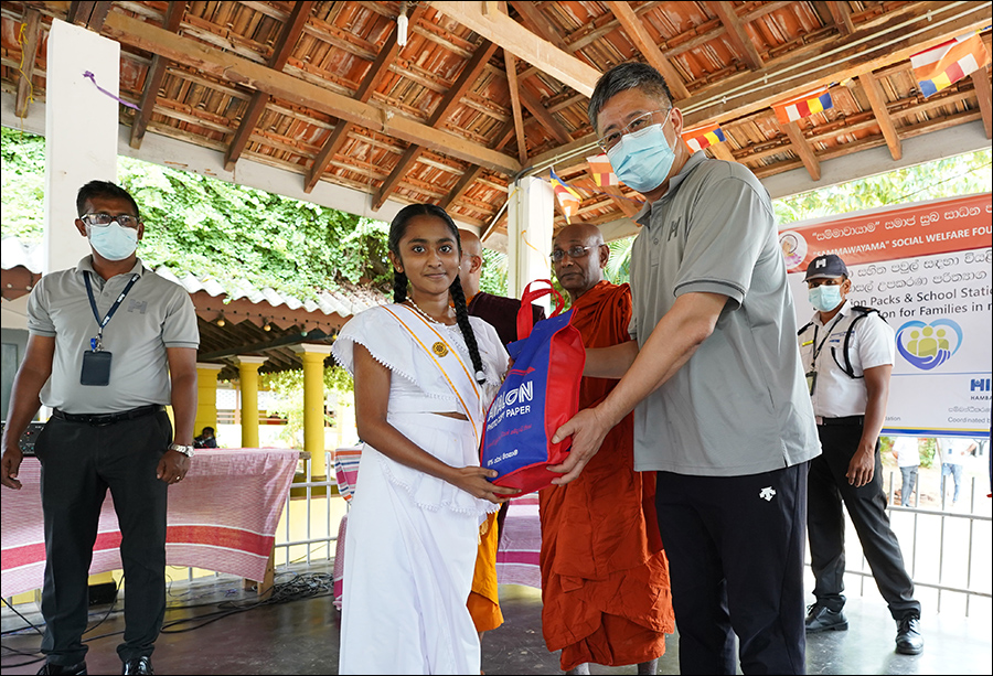 日前,由招商局慈善基金会、汉班托塔国际港口集团有限公司联合发起的“爱心包”慈善捐赠活动在斯里兰卡汉班托塔地区9个寺庙同步举行。这是招商局在斯里兰卡局势陷入动荡后紧急开展的民生关爱活动,覆盖周边7个村庄的1250多户困难家庭、受益人数超过2000人,得到了当地民众的广泛赞誉。招商局集团驻斯里兰卡首席代表兼汉港公司首席执行官刘恩怀与斯里兰卡南部首席僧王Wimalabuddi Thero共同出席了活动。