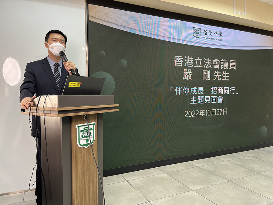 二十大报告对香港经济社会发展有怎样的重大意义、对香港青少年的未来有哪些深远影响?特首施政报告有哪些青少年需要重点关注的内容?围绕这些时事热点,10月27日上午,招商局集团香港青年联合会邀请香港立法会议员严刚来到培侨中学,为包括“伴你成长,招商同行”师友计划成员在内的40名师生,送上了一堂别开生面的专题讲座,并现场回答学生提问、与他们亲切互动交流。招商轮船总经理王永新,香港教联会副主席穆家骏,集团在港青联、招商港口等有关人员参加了此次专题见面会。