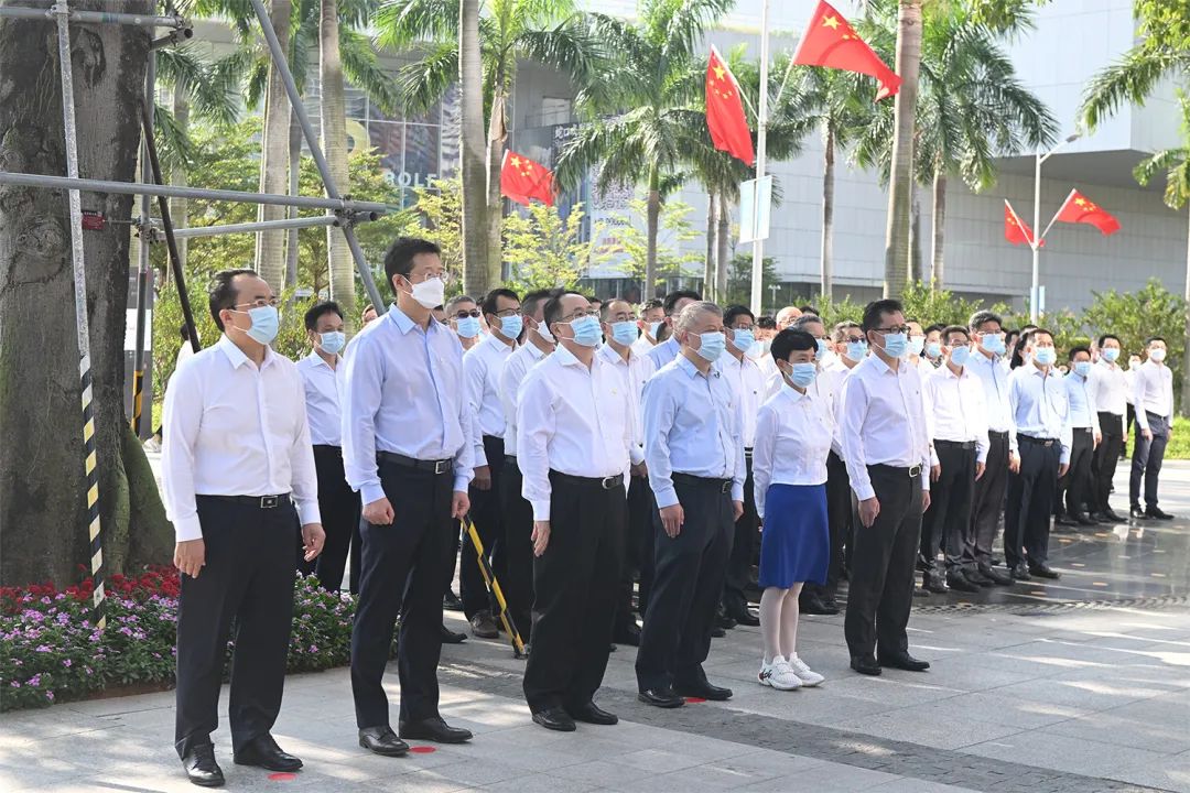 在深集团领导及集团总部员工代表参加升旗仪式,并观看集团董事长缪建民公司日致辞