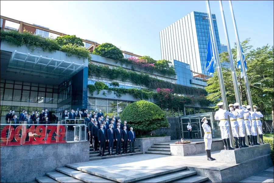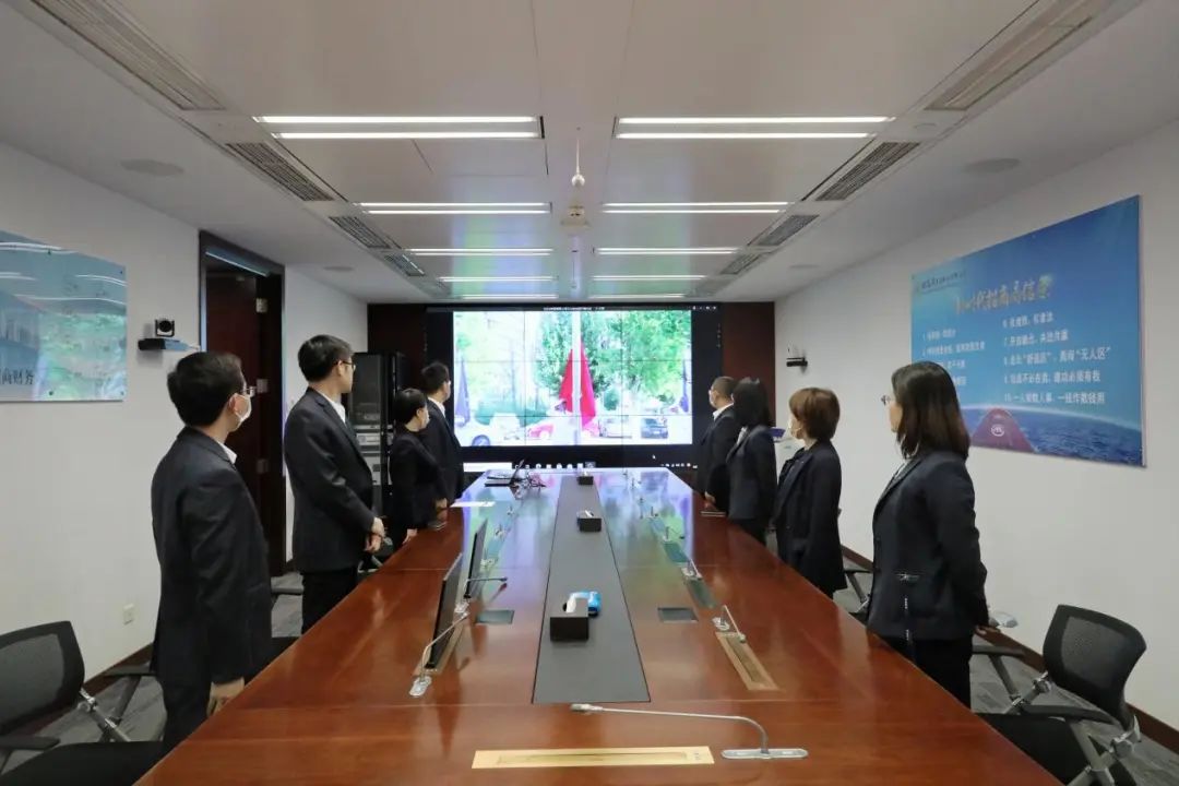招商港口领导及总部员工参加升旗仪式,深港两地员工共同观看集团董事长缪建民公司日致辞。