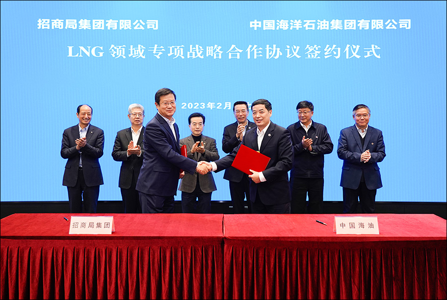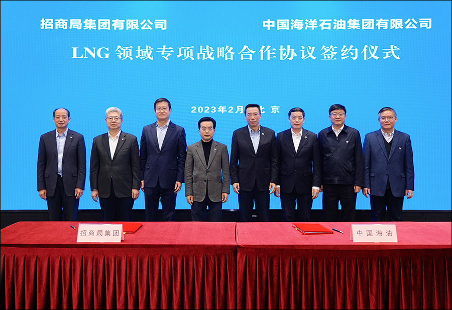 2月6日,招商局集团与中国海油在京签署LNG领域专项战略合作协议。在集团董事长缪建民与中国海油董事长汪东进见证下,集团副总经理邓仁杰与中国海油副总经理俞进代表双方签署协议。集团总经理助理、办公室主任张军立,中国海油董事会秘书、办公室主任田文学等参加活动。