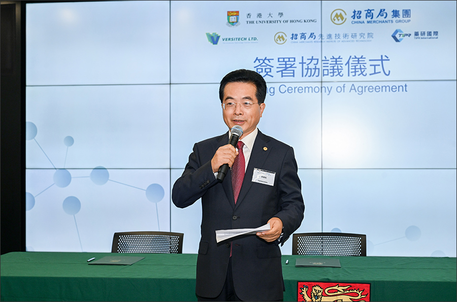 缪建民在致辞中指出,香港大学是全球最知名的高等学府之一,是香港的靓丽名片,与招商局同属“百年老店”。当前,招商局集团正全面加速推进“第三次创业”,通过组建招商创科,在香港设立先进技术研究院、狮子山人工智能实验室等,积极布局数智科技、生命科技、绿色科技等关键领域,以科技创新引领产业创新,大力发展新质生产力。希望双方以此次签约为契机,全面深化科技创新合作,充分发挥各自在科学研究、产业应用两方面的优势,围绕关键底层技术开展科研攻关,加快掌握制胜未来的“关键一招”,广泛汇聚国内外顶尖人才和知名科研伙伴,通过市场需求牵引科技创新,共同打造粤港澳大湾区新一代药物研发的原创技术策源地,助力香港国际创科中心建设。