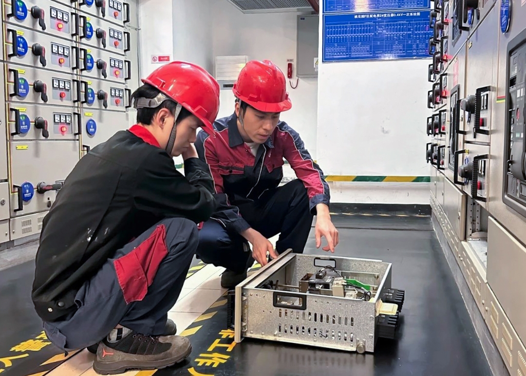 谢磊与同事在高压配电房对设备进行预防性维护,确保电力设备安全运行