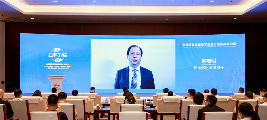 9月5日上午,由服务贸易创新发展引导基金(以下简称“服贸基金”)主办的贸易新业态暨数字贸易投融资高峰论坛在北京国家会议中心成功举办。此次论坛是2022年中国国际服务贸易交易会(服贸会)的重要专业性论坛之一,商务部财务司司长袁晓明视频致开幕辞。商务部、财政部、北京市房山区政府、湖南省财政厅、山东省商务厅、商务部研究院国际服务贸易研究所、中国信保、江苏金财、苏高新金控等单位近百位嘉宾汇聚一堂,分享洞见、凝聚共识,共享贸易新业态暨数字贸易领域投融资发展经验和成果,共话服务贸易新未来。招商局资本管理(北京)有限公司董事长、执委会主任郭健主持论坛。