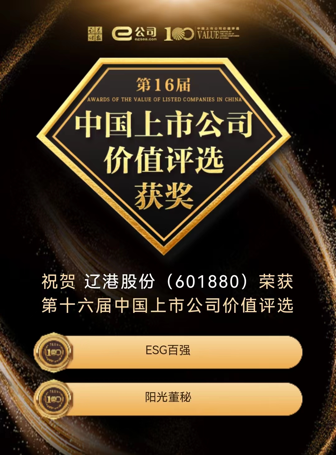 9月22日,由证券时报主办的“第十六届中国上市公司价值评选”获奖名单正式揭晓,辽港股份(601880.SH)荣获“中国上市公司ESG百强”和“中国上市公司阳光董秘”两个奖项。