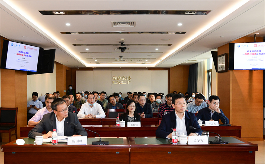 讲座中,杨永斌院士以“桥梁动态感知——车辆扫描法最新进展”为题,从当前公路桥梁管理养护难、传统检测技术供给不足的背景出发,提出车辆扫描法这一智慧管养系统,并从车辆扫描法的理论简介、力学模型和增效技术等三方面进行分析讲解。车辆扫描法集成了众多先进技术,通过记录通过桥梁时的车体加速度时程响应,并从桥梁响应频谱找出桥梁频率,用滤波器提取某一桥频的分量响应,建立该桥频的瞬时(当下)振幅历时,得出对应于该桥频的模态。讲座中,桥梁加固院、招商路检、物康公司的科研一线员工结合自身岗位实践,与杨永斌院士进行了深入的互动交流。