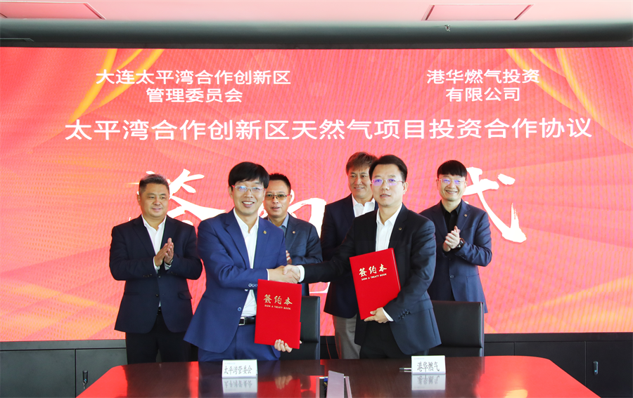 近日,大连太平湾合作创新区管委会与港华燃气投资有限公司签署天然气项目投资合作协议。港华燃气副总裁李浩、业务支援总监李瑛,招商局太平湾总经理胡勇、副总经理赵永勃、王洪源出席。