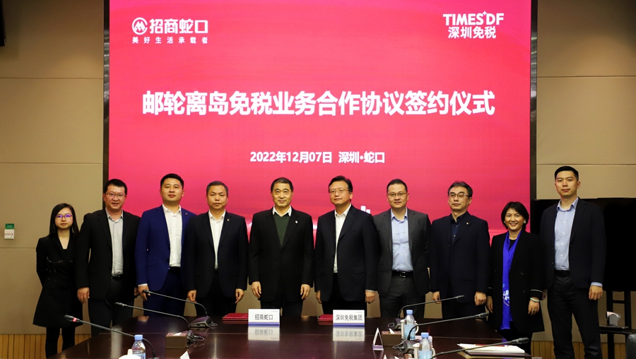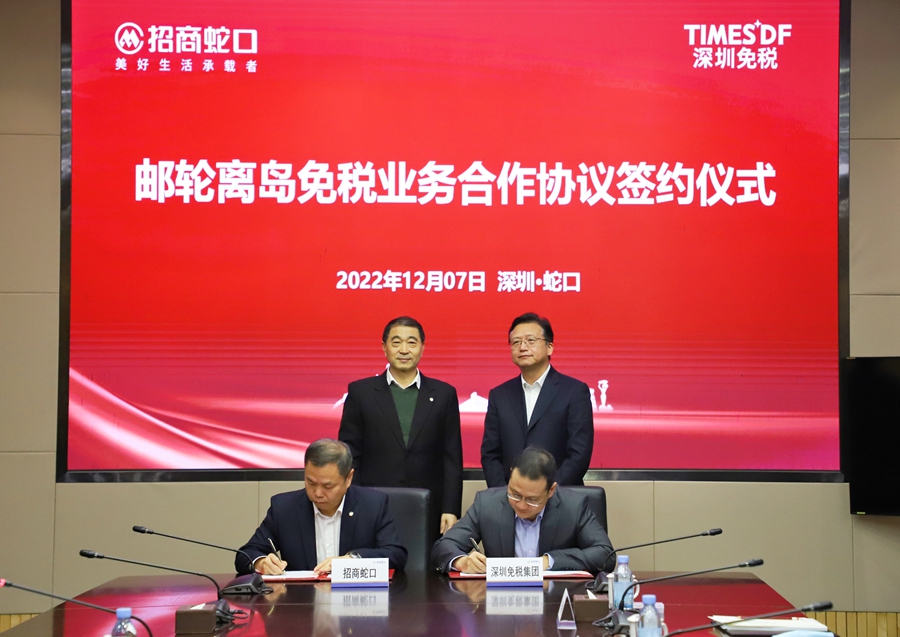 12月7日,招商蛇口与深圳免税集团在深圳蛇口举行邮轮离岛免税业务合作协议签约仪式,标志着五星旗邮轮“招商伊敦号”离岛免税项目成功落地。这是11月30日集团董事长缪建民拜会海南省委书记沈晓明、省长冯飞,就进一步加强全方面合作等进行会谈后落地的首个项目。招商蛇口董事长许永军、深圳免税集团董事长尤江伟见证签约,招商蛇口安全生产总监、招商邮轮总经理吴炜与深圳免税集团副总裁、深免海南运营总部公司董事长曾琦代表双方签约。