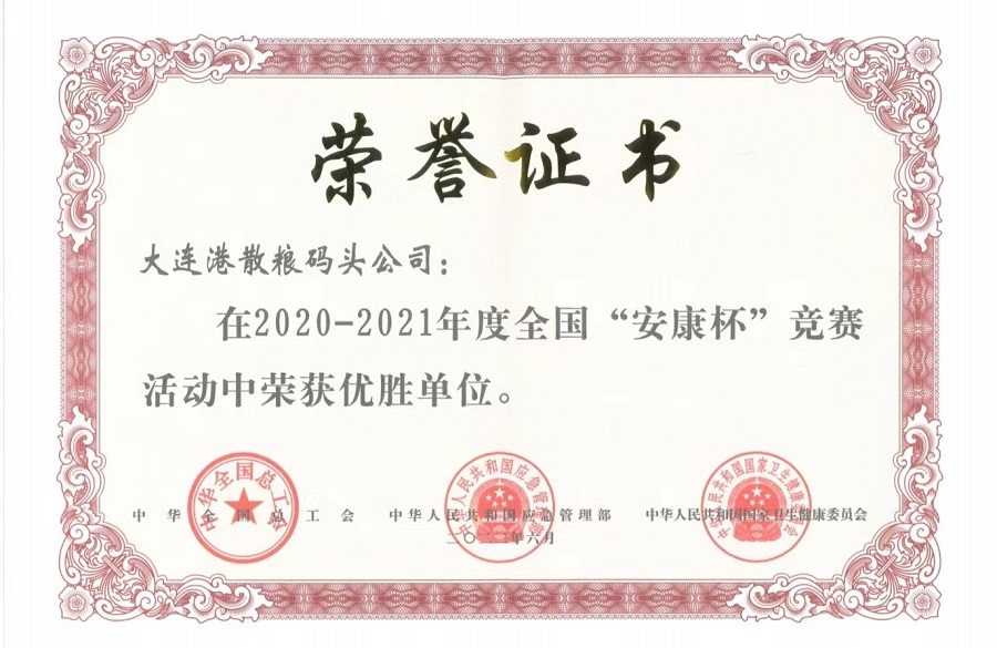 近日,中华全国总工会、应急管理部、国家卫生健康委员会联合表彰2020—2021年度全国“安康杯”竞赛活动先进集体和优秀个人,大连港散粮码头公司获竞赛优胜单位荣誉称号。