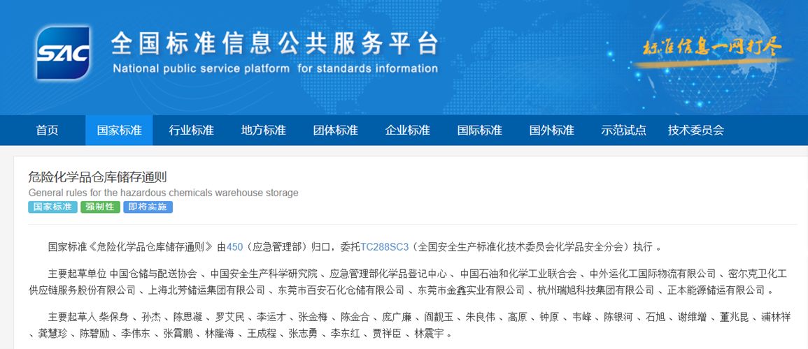 2022年12月29日,国家市场监督管理总局和国家标准化管理委员会联合发布了强制性国家标准——《危险化学品仓库储存通则》(GB15603-2022),中国外运所属外运化工作为主要起草单位参与了该标准的修订工作。