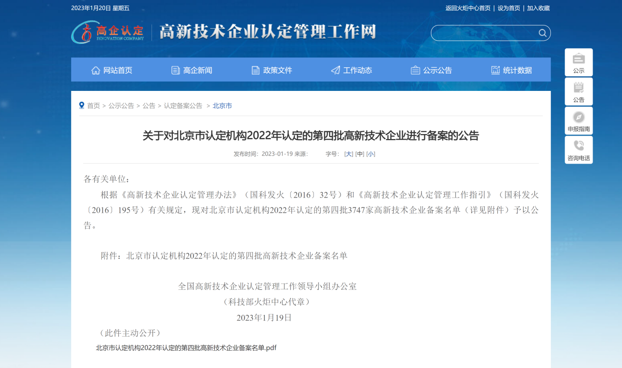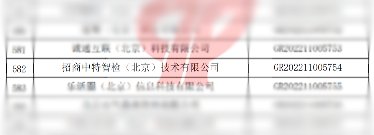 近日,全国高新技术企业认定管理工作领导小组办公室发布《关于对北京市认定机构2022年认定的第四批高新技术企业进行备案的公告》,招商检测下属招商中特智检(北京)技术有限公司(简称“招商中特”)位列其中,顺利通过高新技术企业认定。