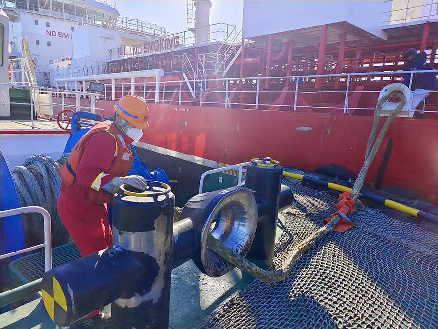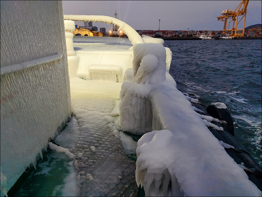 1月22日(大年初一)夜间,海上风力逐渐增大至6到7级,气温降低至-10℃以下,涌起的海浪在船舶甲板上结成厚厚的“冰衣”。参与大连港油品码头船舶作业期间,拖轮因风浪较大摇晃剧烈,该公司在带缆环节增派人员相互协助,并借助防滑网、防滑绳等克服恶劣天气的不利影响,最终顺利完成重点船舶作业任务。(辽港集团 供稿)