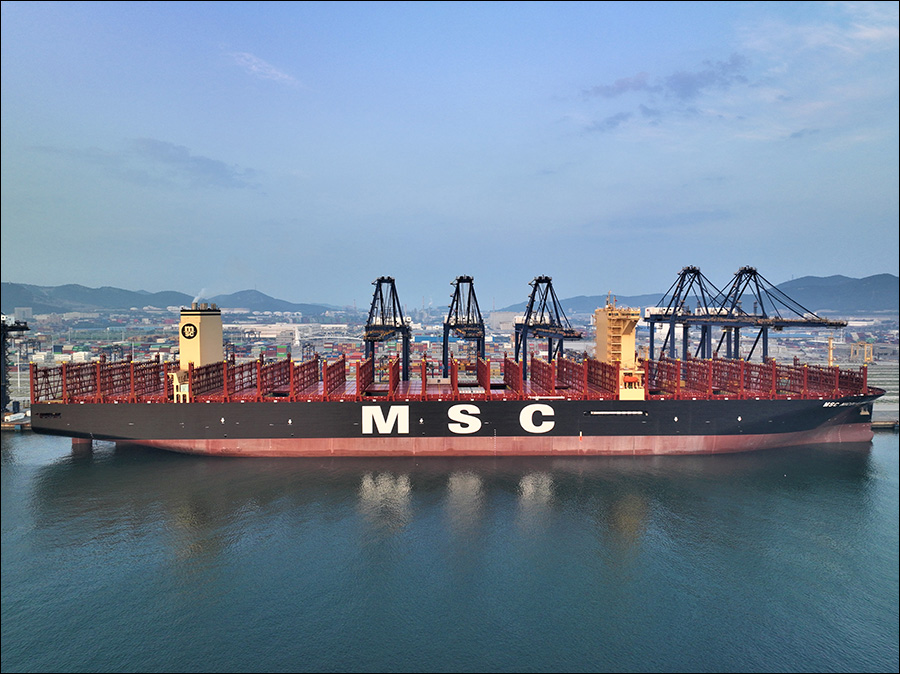 “地中海尼古拉马斯特罗”轮由中国自主设计建造,于今年6月15日在上海交付下水。该轮总长399.99米,比目前世界最大航母还要长60多米;型宽61.5米,甲板面积近似于4个标准足球场;型深33.2米,最大堆箱层数可达25层,相当于22层楼的高度;最大装载量为24116TEU,是名副其实的海上“巨无霸”和“带货王”。