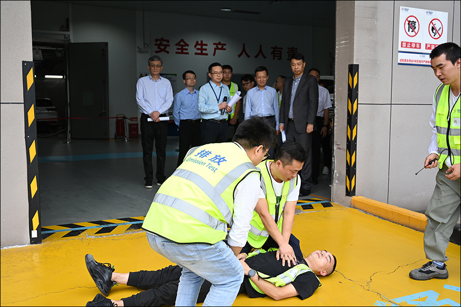 在招商车研金凤基地排放部轻型车排放实验室,刘英杰观摩了“有限空间中毒事故应急救援疏散演练”并进行讲评。他指出,通过演练进一步增强了从业人员的安全防范意识,使从业人员熟练掌握有限空间中毒事故的处理步骤和救助常识,强化了应对有限空间中毒事故的抢险技能。