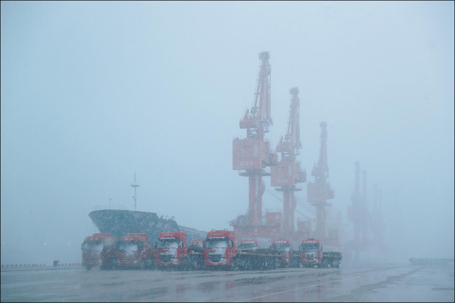 极端天气到来前,大连港区域各公司迅速响应,立即启动应急预案,全面落实防寒、防冻、防风、防雨等各项应急措施,并根据气象条件及时恢复作业。