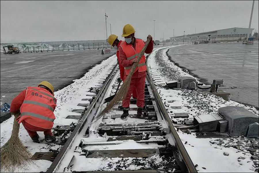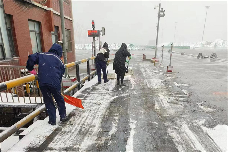各清雪责任单位以雪为令,按照保障港口生产的原则,全力组织清雪工作,第一时间对铁路专用线及铁路走行线主干道和码头作业区、库场作业区等区域进行清理,并明确了积雪堆放地,尽快恢复生产作业;后勤保障单位准备充足的融雪剂和抛洒融雪剂车辆,为各清雪责任单位做好服务,保证清雪质量;安全与环保监督部对清雪情况进行监督检查,以监管措施到位确保清雪任务顺利完成。