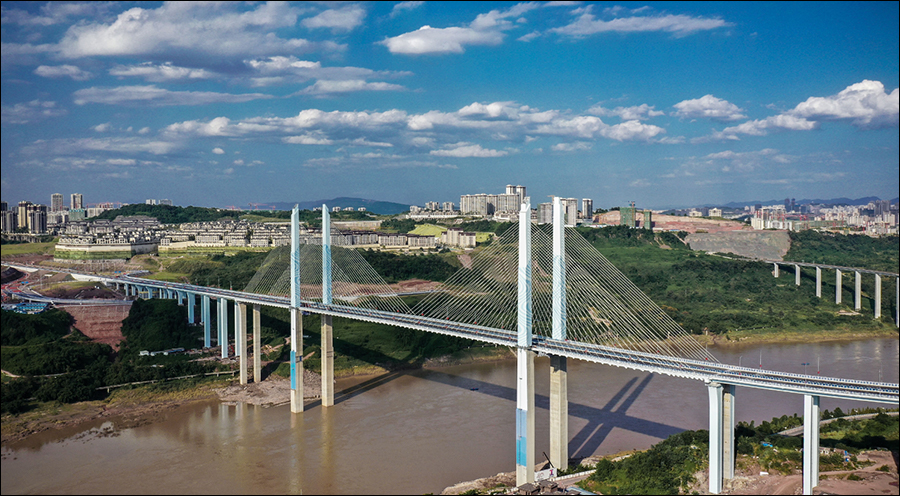 重庆市蔡家嘉陵江大桥主桥为(140+320+140)米等高双塔双索面斜拉桥,采用全过程景观设计,主题突出,与重庆两江四岸风貌融合。主梁宽度达37.5米,为重庆市范围内最宽PC梁斜拉桥,设计采用了“双边箱+加劲肋”的断面形式和超宽PC梁设计施工关键技术。首次在大跨径超宽主梁斜拉桥的无上横梁塔柱中采用竖向预应力,解决了主梁曲线布置下简约桥塔不利受力的关键技术问题。(招商交科 供稿)