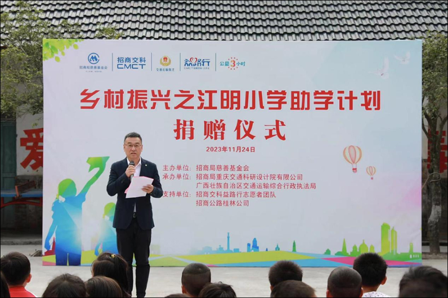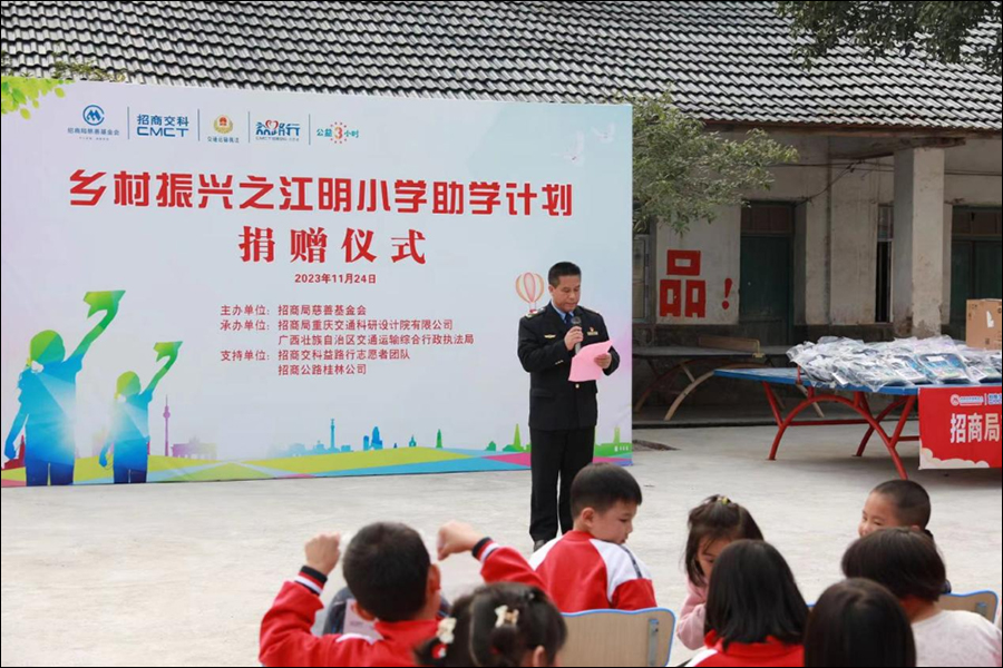 11月24日,由招商局慈善基金会主办、招商交科协同广西壮族自治区交通运输综合行政执法局(简称“广西交通执法局”)承办的广西乡村振兴“江明小学助学计划”志愿者活动暨捐赠仪式在广西全州举行。