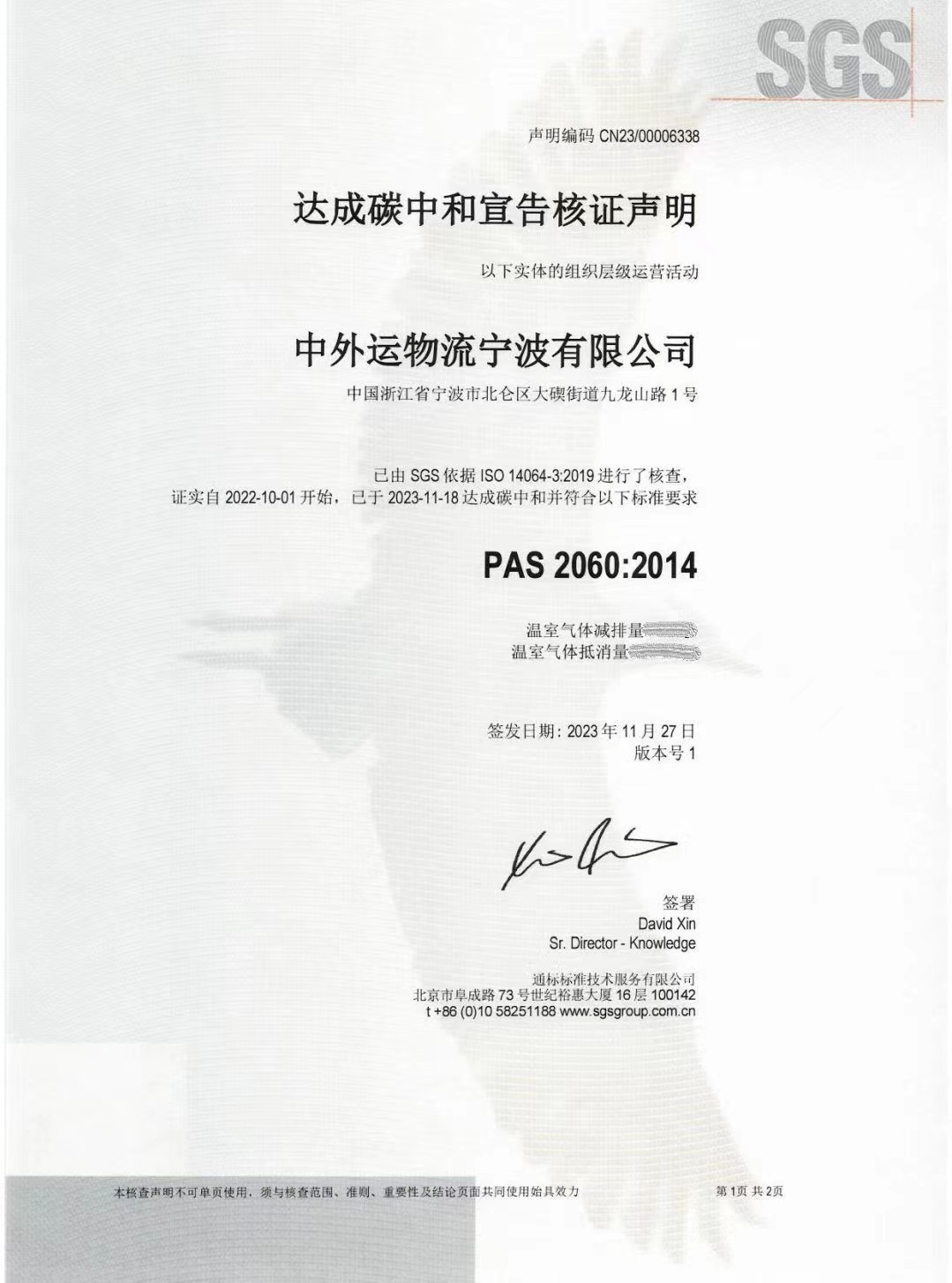近日,通标标准技术服务有限公司(SGS)为中国外运旗下中外运物流宁波有限公司(以下简称“宁波北仑园区”)颁发PAS 2060达成碳中和宣告核查声明证明,标志着中国外运首个“零碳”物流园区诞生。