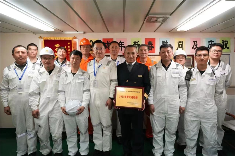 在船员座谈会上,王永新为“中外运新港”轮颁发“招商轮船2023年度先进船舶”奖牌,对全体船员在安全生产工作中作出的贡献表达衷心感谢,他充分肯定“中外运新港”轮的船容、船风和船貌,并为春节期间坚守岗位的船员送上关怀和祝福。