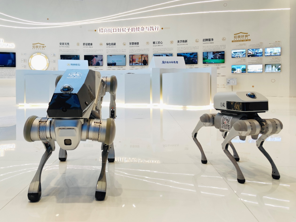 在招商蛇口“招商好房”展厅内,狮子山人工智能实验室推出的智能机器狗成为关注焦点。该产品融合了先进的自主规划、动态导航与智能交互能力,生动演示了其在社区安防巡逻等多样化场景中的应用潜力,吸引众多参观者驻足交流。